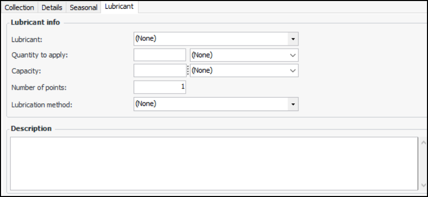 9. If the indicator type specifies that lubricant information is available on indicators of that type, the Lubricant tab is available. Select the tab to enter information about the lubricants, such as grease or oil, required for the route.