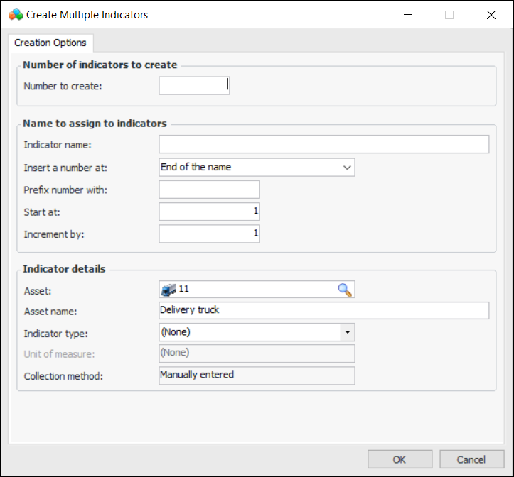 You can use the Create Multiple Indicators window from the site’s or asset’s Inspection Management view or from a maintenance action plan in a strategy development analysis. This topic explains how to create multiple indicators from the Asset window’s Inspection Management view.To Create Multiple Indicators