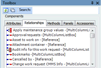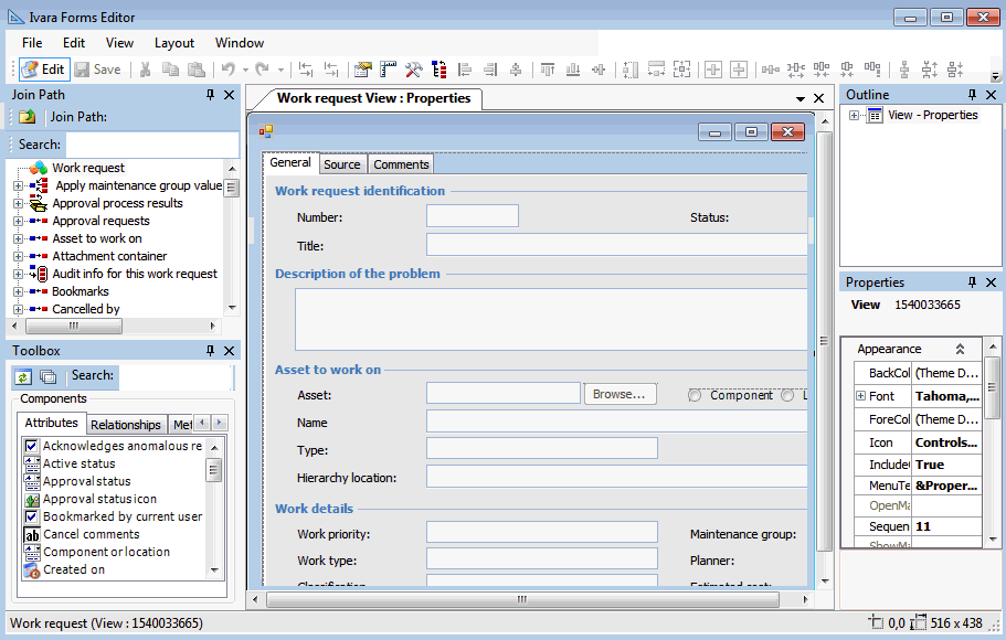 4. To see more information about the attributes and relationships linked to an object, you can edit the view you are looking at. From the View menu, select Edit View. The APM Forms Editor window appears, with Work Request view:Properties displayed in the Layout panel.By default, the Toolbox panel appears at the bottom left corner of the Forms Editor. This panel shows object model items that you can add to the user interface.
