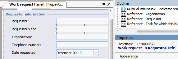 7. On the Work Request layout panel, select the Source tab. This tab shows an Alarm acknowledgments multi-column list box (MCLB) or table.The Properties panel also displays the relationship information. Click a field on the Work Request Panel that is on the layout panel to view the relationship at the top of the Properties panel. For example, click the box beside the Requestor’s title label and view the relationship:
