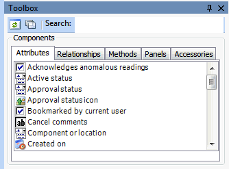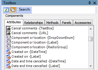 5. The Attributes tab displays attributes for the context class. The icons represent the data type of each attribute. The data type determines how the attribute will be displayed on the user interface. For example, if you drag the Date Requested attribute onto the Work Request Form, it will show a field with a dropdown arrow that, when clicked, opens a calendar:You can click the “show full” iconin the Toolbox to view the characteristics of the attribute. For example: