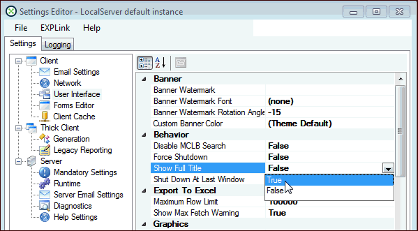 Note: To see the join path information in the status bar, you must be logged on as an APM administrator.The object ID information is useful for some customizations. To view the object IDs in the title bar of every object, open APM Configuration, select the thick-client instance, and click Full Settings. In the Settings Editor, click the File menu and then Show Advanced Settings. Under the Client node, select User Interface. Set the Show Full Title option to “True”. For example:To Explore the APM Object Model Through the User Interface