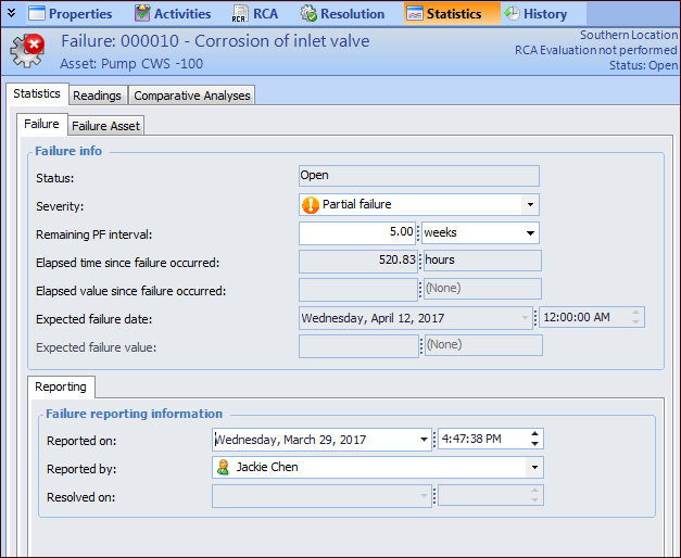 • Open: APM continues to track failure statistics and the PF interval (if appropriate) for the failure.
