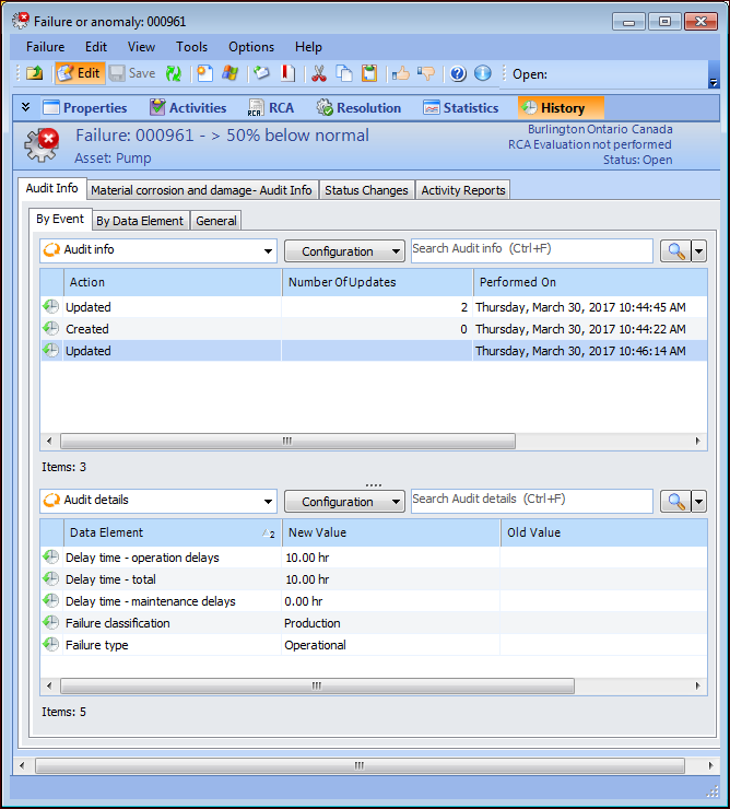 By Data Element tabs list the actions performed on the failure record, the date when each action was performed, and the APM user who performed it. Whether you view the actions according to event or data element, you can see the new and old values for each data element. For example: