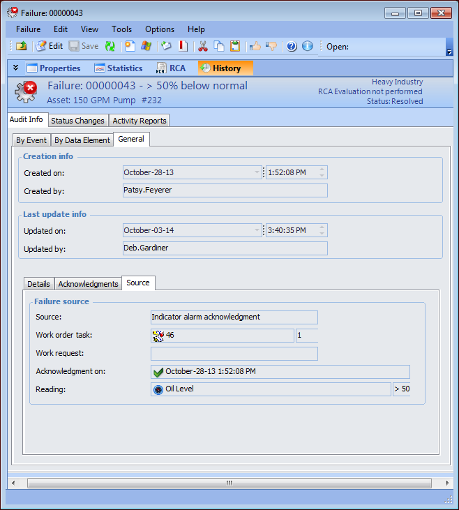 General tab displays information about the creation of the record, the most recent update, failure details, and the source of the failure record, for example, from an indicator alarm acknowledgment. In this case, the indicator reading that was acknowledged is also listed. For example: