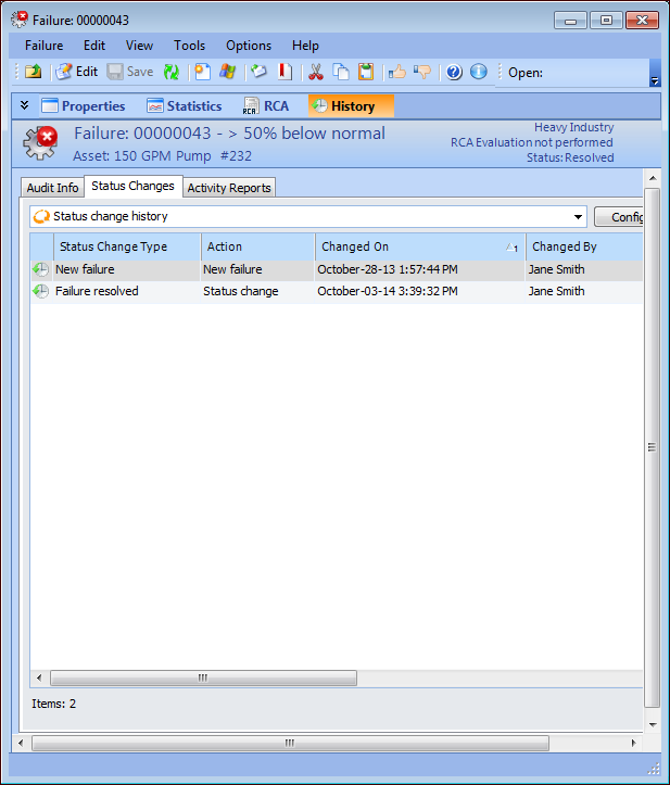 The Status Changes tab lists information about the following status changes: