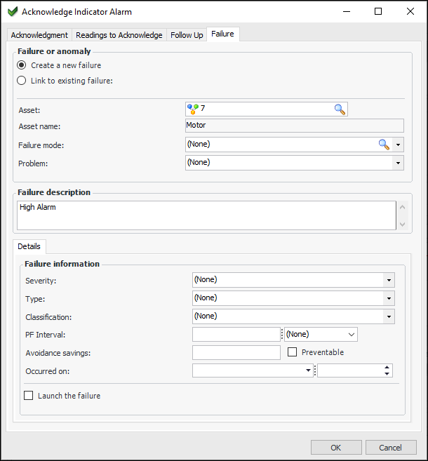 Request for work is available instead of APM work documents when APM uses AssetWise Enterprise Interoperability (AWEIS) to exchange data with an external CMMS. The site’s interoperability profile specifies whether APM or interop documents are in use. For more information, see Creating a Failure to Acknowledge an Alarm with AWEIS.In the Acknowledge Indicator Alarm dialog, the Failure tab is available when the Create or link to a failure and anomaly option is selected on the Acknowledgment tab. This option is selected by default when the site’s indicator state default settings and the indicator state settings specify that failure records be created for alarm acknowledgments. You can change the default values when creating the acknowledgment.The failure record is created for the indicator’s asset. The source of the failure is defined as Indicator alarm acknowledgment. The status of the failure is Open unless the alarm is acknowledged as “fixed during inspection”.If the problem was fixed during inspection, the failure’s status is Resolved. The Resolved on and Returned to service on dates are set to the date and time that the alarm was acknowledged. The Resolved by value is the employee who acknowledged the alarm. The resolution description is populated with the collector’s note from the indicator reading.Note: After saving a failure record, you must use the Change buttons or the commands on the Tools menu if you wish to change the following information: asset information, failure dates, severity level, PF interval. You cannot simply enable editing to change this information because the failure statistics for all affected assets might require recalculation. For more information, see Editing Failure Records.To Create a Failure When Acknowledging an Alarm