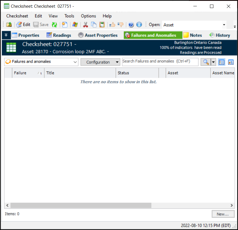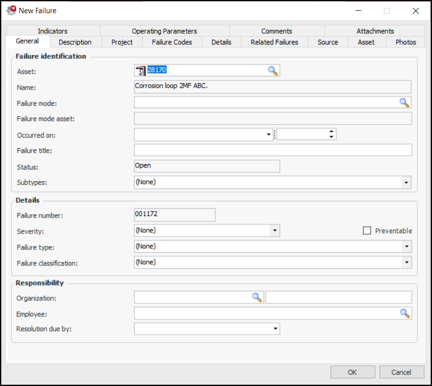 You can create failure or anomaly records when acknowledging indicator warnings and alarms, for example, to track corrective work. However, you can also create failure records when the indicator is not in alarm, for example, to track asset anomalies observed while taking readings. Using the Checksheet window’s Failures and Anomalies view, you can create failure records, as well as view the records created from acknowledgments.This topic explains how to create a failure record from a checksheet. For more information about completing a checksheet, see Entering Readings on a Checksheet.Note: After saving a failure record, you must use the Change buttons or the commands on the Tools menu if you wish to change the following information: asset information, failure dates, severity level, PF interval. You cannot simply enable editing to change this information because the failure statistics for all affected assets might require recalculation. For more information, see Editing Failure Records.To Create a Failure Record from a Checksheet