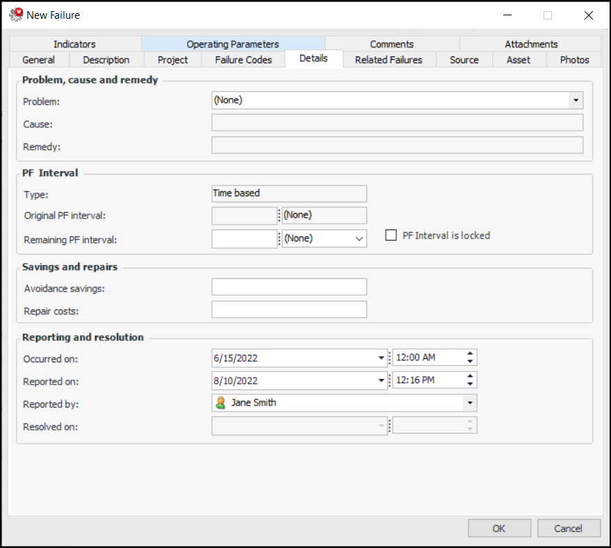 • If the failure is associated with a problem defined for the asset type rather than a failure mode, select the Details tab. Select a problem from the list and, if appropriate, the cause and remedy. The selected problem’s description, failure type, and failure classification are copied to the failure record and shown on the General tab.