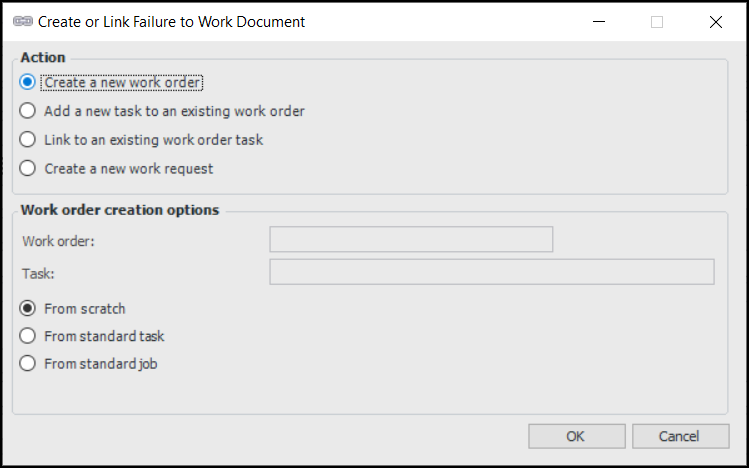 1. Open the failure. From the Tools menu, select Link to Work Order. The Create or Link Failure to Work Document dialog appears.