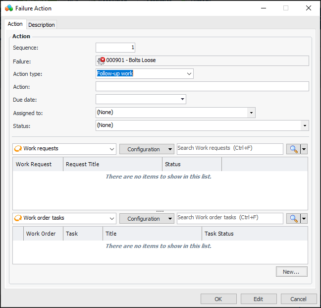 7. Select the Description tab to provide more information about the failure action.To Request a Follow-up APM Work Document