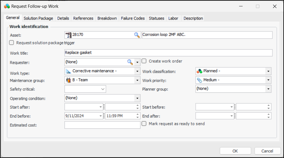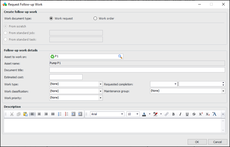 1. In the Failure Action dialog, click New. The Request Follow-up Work dialog appears. For example:Tip: If the request for work’s work type requires risk assessment, you can perform it from the Failure Action dialog, Action tab. Right-click the request for work in the table and click Assess Risk. The Anomaly Risk Assessment dialog appears. For information about using this dialog, see Performing Risk Assessment on a Request for Work. When you have completed the anomaly event, it is displayed in the Anomaly Events view in the Failure Event window.To Request a Follow-up SAP Maintenance Order