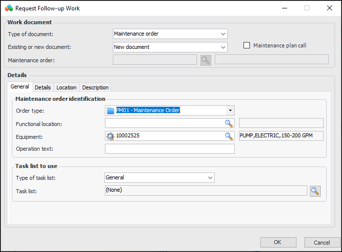 5. Click OK. The Request Follow-up Work dialog closes. The maintenance order is created or updated in SAP. The maintenance order is listed in the Failure Action dialog.