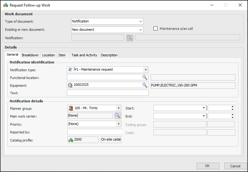 • Select the maintenance order and click OK. The maintenance order number and description are displayed in the dialog.