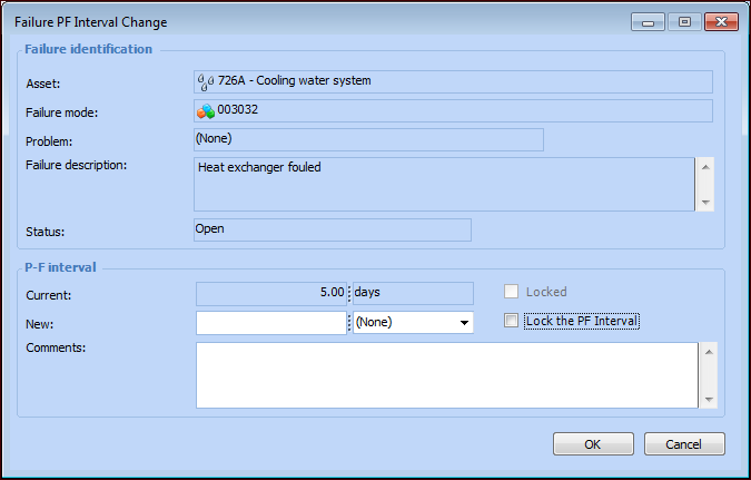 3. To prevent APM from recalculating the PF interval for the failure, select Lock the PF Interval. While it is locked, the PF interval can be manually changed, but it will not be recalculated by APM.