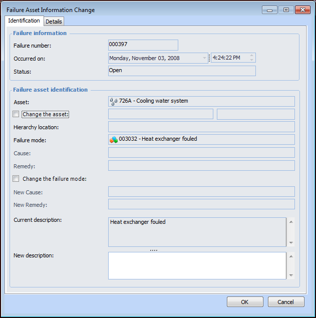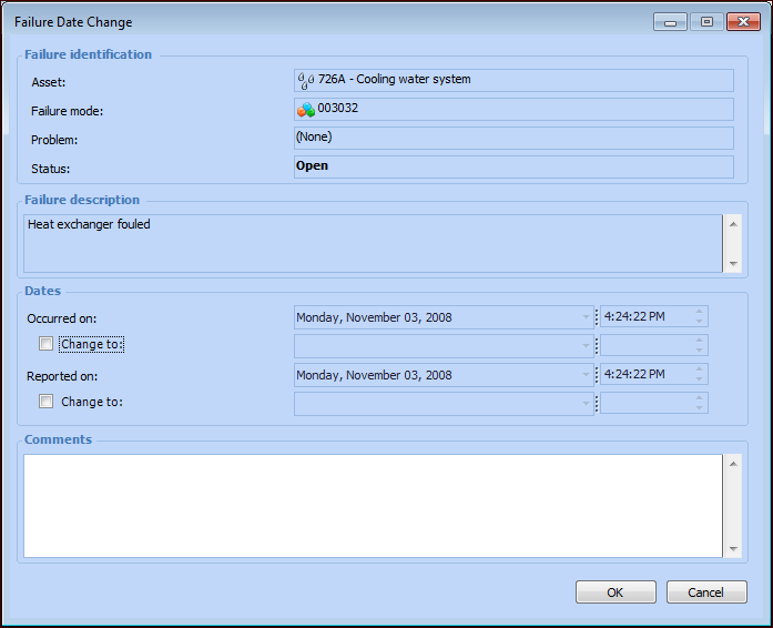 Change buttons are available for dates and severity level. If you need to change the dates when a failure occurred or was reported, click Change next to the Occurred on boxes. You can also change the severity level by clicking Change next to the Severity box. You can also select commands in the Tools menu to change information.Note: To change information in a resolved failure record, you must first reopen it. For more information, see Reopening a Failure Record.Tip: You can view changes to the failure record’s key information on the History view.To Edit Asset Information