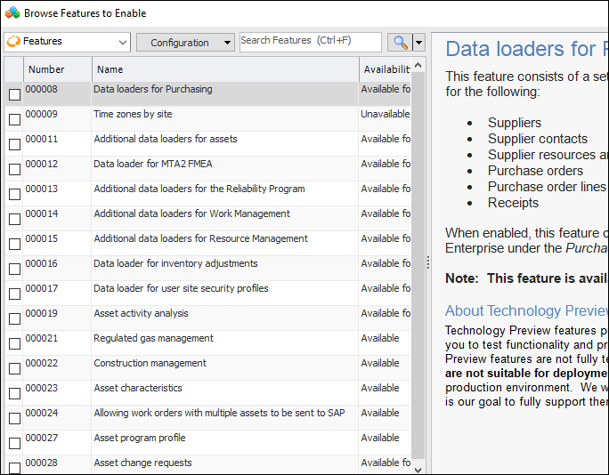 • Available for preview – Technology preview features provide early access to upcoming product innovations, allowing you to test functionality and provide feedback during the development process. Technology preview features are not fully tested and might not be functionally complete. As such, they are not suitable for deployment in production. However, you might find them useful in a non-production environment. We welcome your feedback and suggestions for improvement as it is our goal to fully support them in the futureTip: In the Bentley Communities page for Features Management, you can view current lists of features that are available and available for preview.To View Available Features from the Site