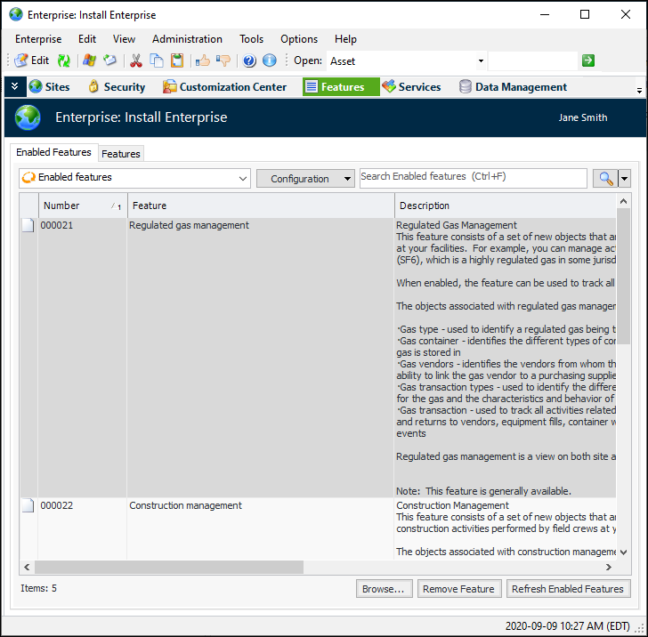 1. Open the Enterprise window, select the Features view and the Enabled Features tab. This tab shows features that have been enabled for your enterprise.