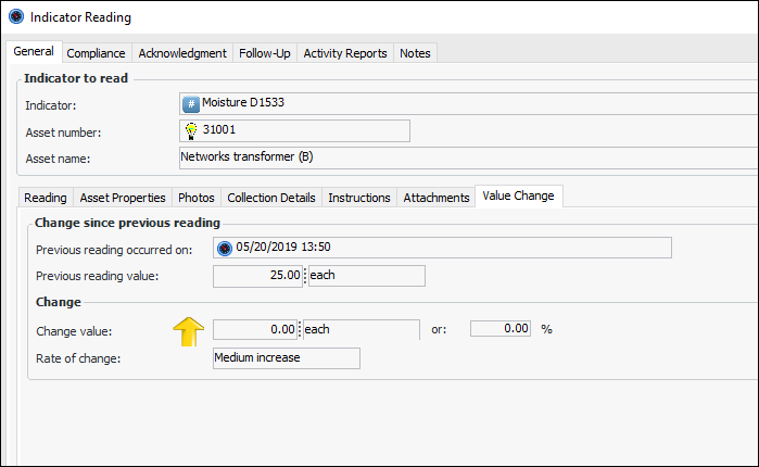 Once fluid condition value lists have been defined, you can set up indicator templates and add them to standard task templates so that checksheets can be generated for collecting samples. For more information, see Setting up Indicator Templates for Fluid Sample Collection.In indicator readings, the Value Change tab displays the change since the last reading, change value, and rate of change. For example:To Create an Indicator Template to Record Rate of Change