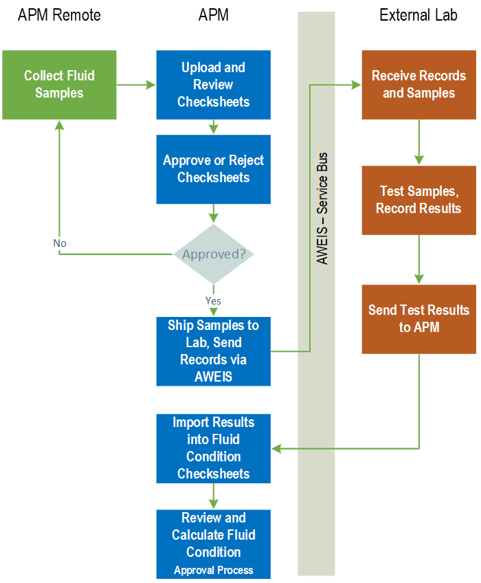 Note: Recording fluid samples on indicator readings and tracking fluid condition test results are “generally available” product features. You must first enable features 53 and 54 to use the functionality in APM. In the Enterprise window, select the Features view and the Enabled Features tab. Click Browse, select “Fluid condition tracking and results” and “Fluid sample support” and click OK. If APM is running as a smart client, click Refresh Enabled Features on the server. Then restart the client to use the functionality.Fluid Sample and Condition Tracking Process