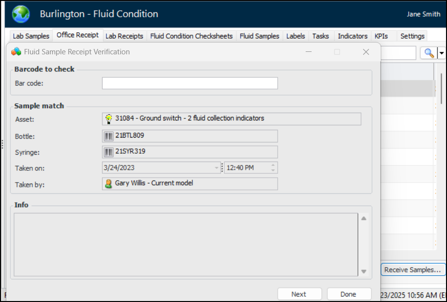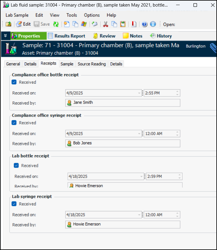 Before the samples are sent to the lab, the internal compliance officer verifies the information on each bottle and syringe, generating a receipt on the lab fluid sample. In the site’s Fluid Condition view, select the Office Receipt tab. The default table configuration lists samples that are “Waiting for office receipt”.Click Receive Samples to open the Fluid Sample Receipt Verification window. When you scan (or enter) a bar code, APM checks that a matching bar code exists in the system, that the bar code has been assigned to a sample, and that it was not previously received. For example:Continue scanning bar codes until you run out of bottles and syringes. When you click Done, the window closes and the samples you scanned are moved to the “Ready to send to lab” configuration.On the Office Receipt tab, select the “Ready to send to lab” configuration and click Send to Lab. The Send Fluid Samples window appears, where you can select the lab, browse for samples to send, and click OK.If testing is performed in a lab within your organization that has access to APM, lab personnel can receive and verify samples. In the site’s Fluid Condition view, select the Lab Receipts tab. Click Receive Samples to open the Fluid Sample Receipt Verification window. As you scan bar codes one after the other, APM matches the codes and records the receipt.You can view a fluid sample’s receipts in the Lab Fluid Sample window. Select the Properties view, Receipts tab. For example:Step 3 - Lab Tests - Import Results