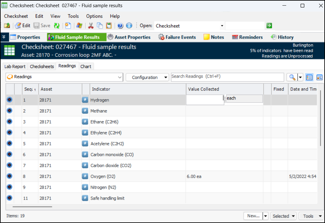 Internal labs can also record test results as indicator readings in the checksheet. In the site’s Fluid Condition view, select the Fluid Condition Checksheets tab and open a checksheet. In the Checksheet window, select the Fluid Sample Results view and the Readings tab. Press F2 to edit a row. For example:Step 4 - Evaluate Fluid Condition