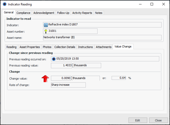 3. If a reading’s indicator type has been set up to track the rate of change between reading values, when you open the reading, the Value Change tab is available on the General tab. For example: