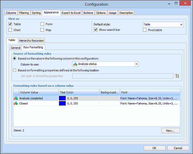 • Enumerated: You can create as many formatting rules as there are enumerated values. For example, you could create four different formatting rules for RCM2 analysis status because there are four possible values.To Format Row Data