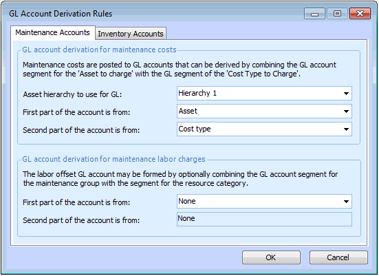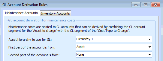 The first part of the GL account to use when posting maintenance costs: Asset, Cost type, or None. The system will derive the maintenance GL account by combining this GL account segment with the segment selected for in the Second part of the account.To use whole accounts instead of segments, select either Asset or Cost type for the First part of the account, and set the Second part of the account to None.