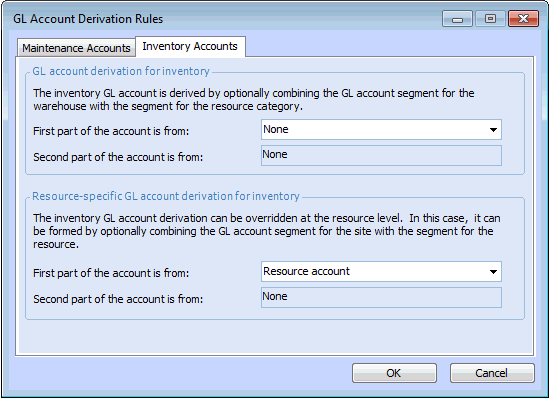 If the First part of the account is set to Resource Account (which is a whole account number), the Second part is automatically set to None.Note: If you select Site account segment for the resource account derivation, you must select an inventory account segment for each site in the site’s Properties dialog. The current list of site segments is displayed on the Inventory tab. For more information, see Selecting Site and Special Accounts.
