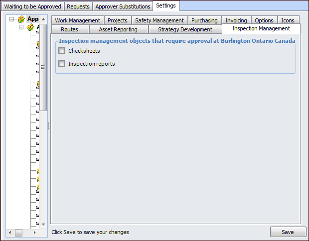 Concepts Tasks Settings Setting up Approvals for Inspection Management To use APM’s document approval function with checksheets and inspection reports, identify the types of documents that require approval at your site and set options for the approval process. This topic describes how to set up approvals for inspection management documents. After entering approval settings, you must set up authorized employees as approvers and create approval routes in order to use approvals with these documents. To Set up Approvals for Inspection Management 1. Select the site’s Approvals view, Settings tab, and then select the Settings in the tree. 2. Select the Inspection Management tab. 3. Click Edit to modify the site settings. The Edit button is replaced by the Save button. 4. Select the types of documents that require approval. 5. Click Save.
