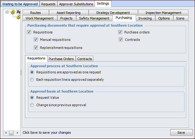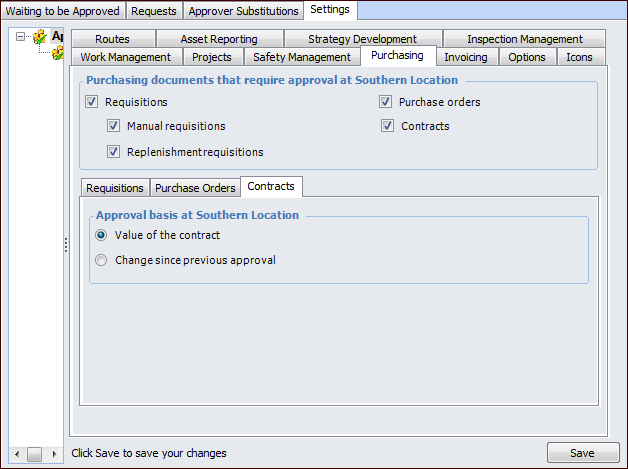 1. On the site window, select the Approvals view and the Settings tab. Select the Settings node in the tree.