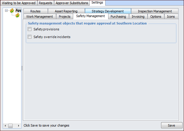 Concepts Tasks Settings Setting up Approvals for Safety Management To use the APM approval function with safety management objects, identify the types of documents that require approval at your site. This topic describes how to set up approvals for safety management. After entering approval settings, you must set up authorized employees as approvers and create approval routes in order to use approvals with these documents. To Set up Approvals for Safety Management 1. Select the site’s Approvals view, Settings tab, and then select the Settings node in the tree. 2. Select the Safety Management tab. 3. Click Edit to modify the site settings. The Edit button is replaced by the Save button. 4. Select the types of documents that require approval. 5. Click Save.
