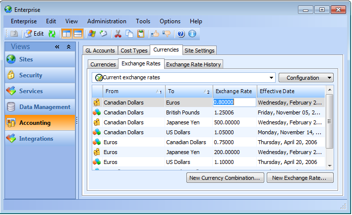 2. Select the Currencies tab, then the Exchange Rates tab. This tab shows a list of all exchange rates entered in the system.