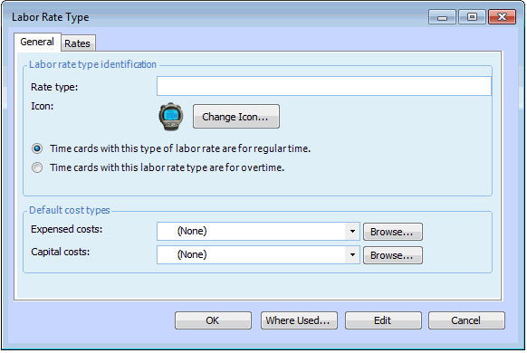 2. Select the Labor Rate Types tab. This tab shows a list of the current labor rate types.