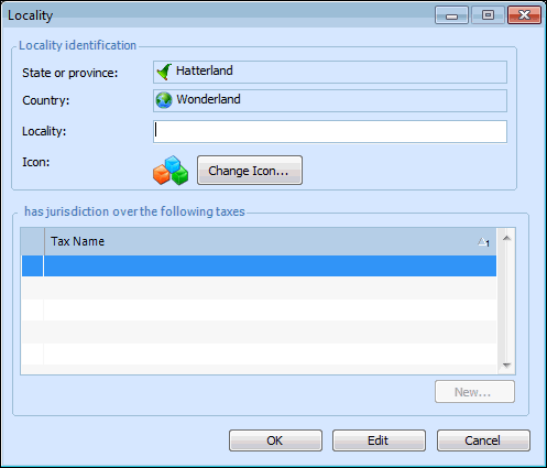 5. Enter the name of the locality and select an icon to represent it. You can enter the taxes that the locality has jurisdiction over in this dialog, or you can enter them as you are setting up taxes. For more information, see Setting up Taxes.