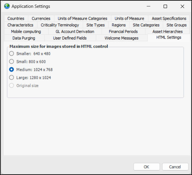Concepts Settings Setting up the Maximum Size for Images Photographs and other images can be added to HTML controls in APM assets, checksheets, failure modes,indicator readings, failure records, and root cause analyses. Picture files must be in one of the following formats: JPG, JPEG, BMP, GIF, or PNG. All images are embedded in the APM database. Therefore, because some image files can be quite large, you can set the default pixel dimensions for images stored in APM. To Set the Maximum Size for Images 1. In the Enterprise window, click the Administration menu and Application Settings. 2. In the Application Settings window, select the HTML Settings tab: 3. Select the appropriate size. 4. Click OK.