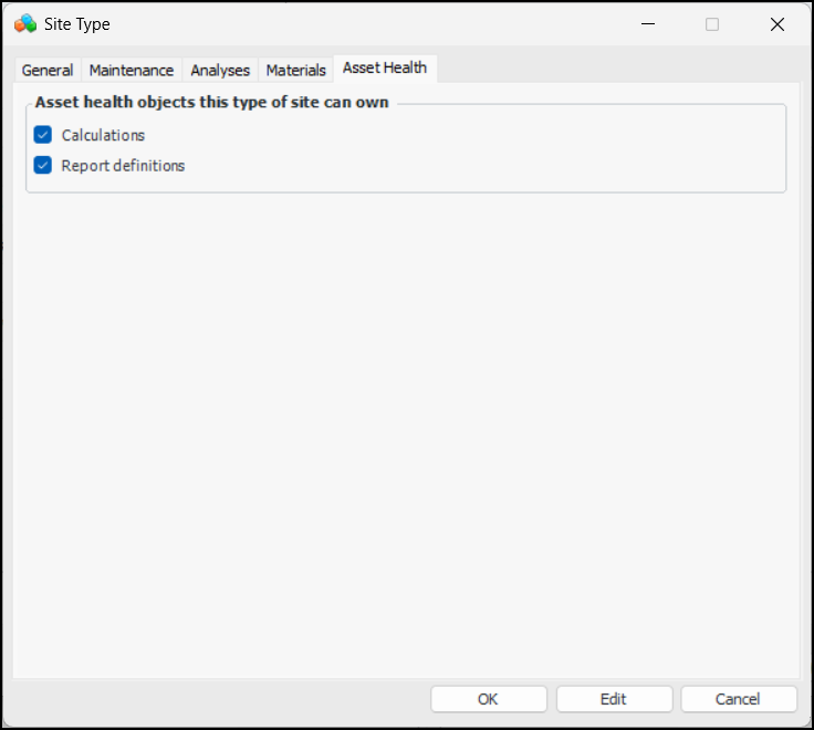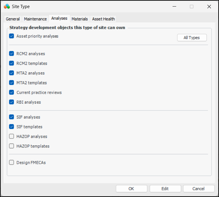 Select this option to allow sites of this type to own asset priority analyses. This option can only be selected if the Assets option is selected first.