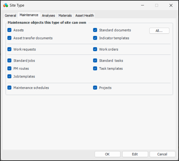 When you select this box, the Asset transfer documents, Work requests, Work orders, Standard jobs, Standard tasks, and PM routes options are automatically selected. It is recommended that these objects be owned by the same types of sites. Except for Asset transfer documents, you can clear any of these options.