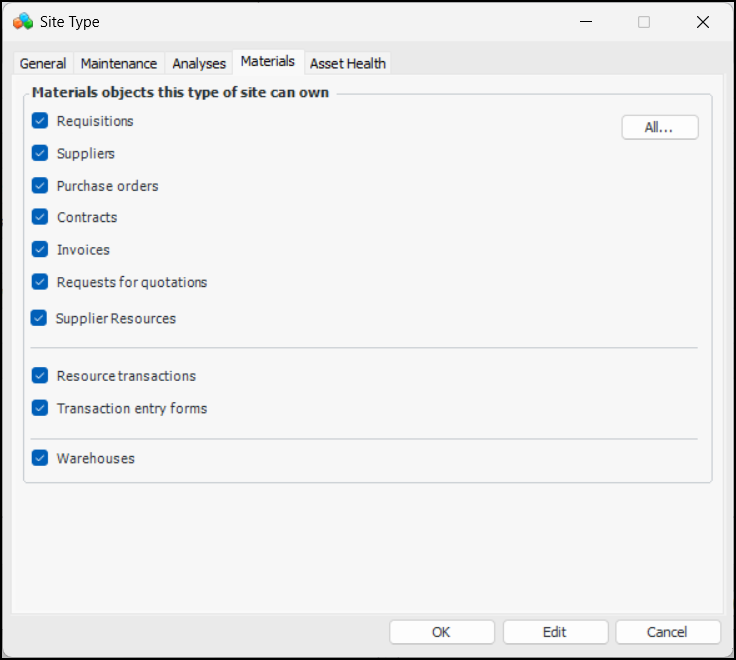 Select this box to allow sites of this type to own warehouses. If you select this option, the Resource transactions and Transaction entry forms options are automatically selected.