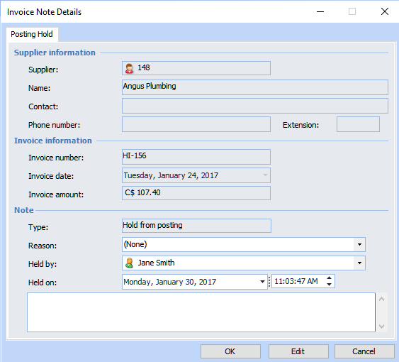 2. Right-click the invoice and select Hold and then From Posting or From Payment. The Invoice Note Details dialog appears.
