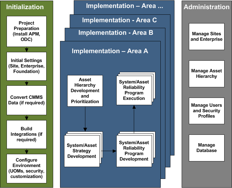 Steps Involved in Implementing APM This section provides an overview of the steps to set up the APM software and use APM to implement your asset reliability process. The following diagram provides an overview of the implementation process: Initialization Initialization involves setting up the APM software and database, defining initial settings, converting your existing data if required, and configuring the environment. Implementation Once the Initialization phase is complete, the APM environment is ready to use for implementing your reliability program in the first area. Typically, you will choose one system or set of assets in which to perform the first reliability program implementation. You will then repeat this cycle in other areas of your organization. Administration In the Administration phase, your APM administrator will make any required updates to the enterprise and site settings, site and asset hierarchy (for example, asset transfers), employee and user lists, and security profiles. For information on administration tasks, see Administration Guide.