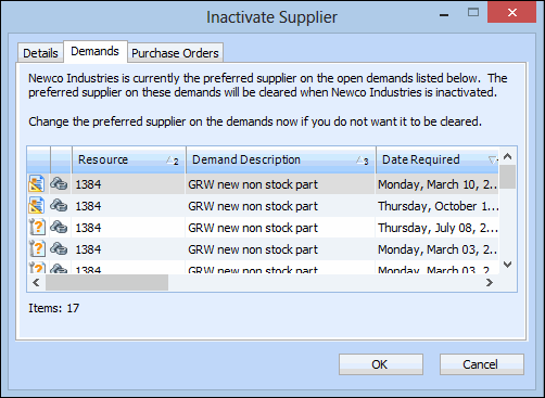 • Resource Demands: inactive suppliers may not be selected as the preferred supplier on a resource demand or as the buyer's selected supplier. When you inactivate a supplier, if the supplier was selected as the preferred supplier on any open purchase demands, the preferred supplier selection on the demands will be cleared.