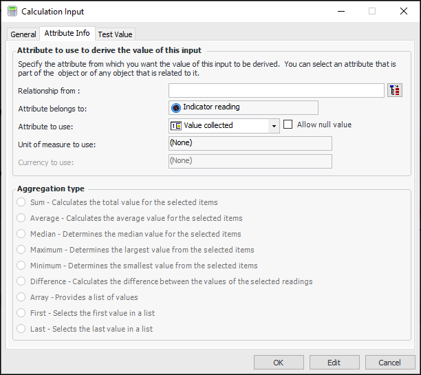 9. Select the Attribute Info tab.On this tab you can select the data that you want to use for the input. The Aggregation type options are available when more than one reading is involved.
