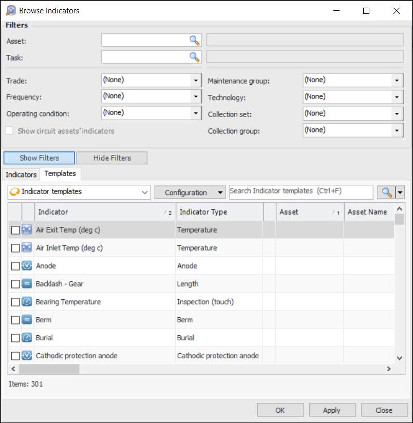 • Indicator using state: Make sure that the alarms and warnings are appropriate for the asset.