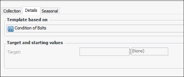 • Cascaded indicator (indicators that take readings from other indicators or are sources for readings for other indicators): Check that the cascade points to the correct indicators on the correct assets.Tip: To view the source template, select the Properties view, General tab, Details tab. For example: