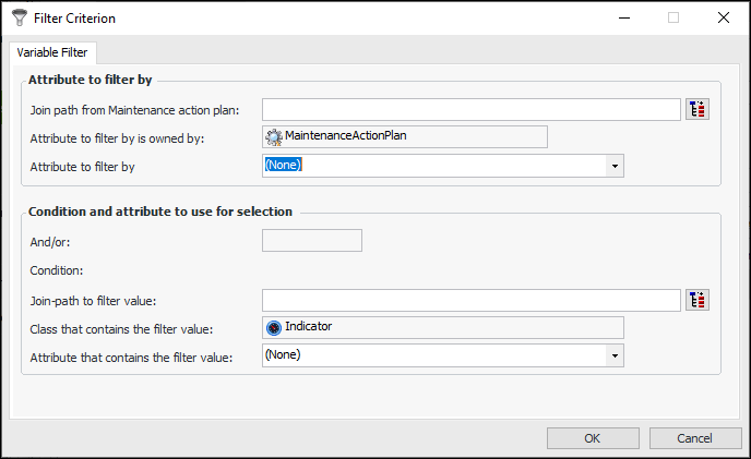 A variable filter allows you to filter a group of objects based on a variable value. The value used in the filter is only determined at the time the filter is used by looking up the current value of the selected attribute or relationship. A specific, fixed value cannot be selected. For example, you might want to filter employee names based on the name of the employee currently logged in, rather than a specific employee name.To do this, you can filter the Work Request class’s Requestor attribute by the Current Employee. Since this data is not part of the Work Request class, you would use a relationship (or join path) to capture that data. In this case, you would select the relationship Enterprise.CurrentEmployee, and the attribute EmployeeName.This topic describes how to create variable filters on an existing calculation input. For general information about using filtering criteria in a calculation input, see Filtering Criteria. For detailed information about creating filter-based calculation inputs, see Creating Calculation Inputs Based on Filters.Note: To create filter-based calculation inputs, you should a good understanding of APM object modeling concepts. To learn more about the object model, see Object Model Overview.To Create a Variable Filter Criteria