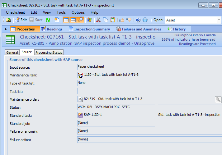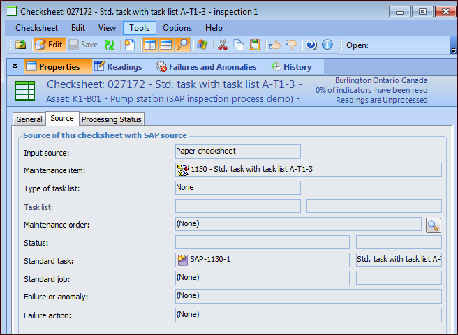 When APM has been configured to interact with SAP Plant Maintenance using APM interoperability, you can link standard tasks to SAP maintenance items or task lists. APM can then generate checksheets using the standard tasks when a maintenance order is created in SAP for the linked maintenance item or task list. When a checksheet is generated in this way, its Source tab displays the SAP information from the standard task, as well as the maintenance order.To View SAP Information in a Checksheet