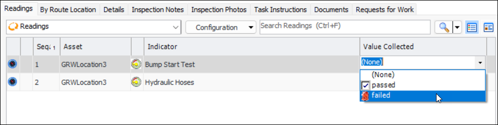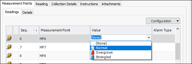 • Readings tab: This tab displays all readings in a list format and allows measurement point readings to be entered using in-place editing. For example: