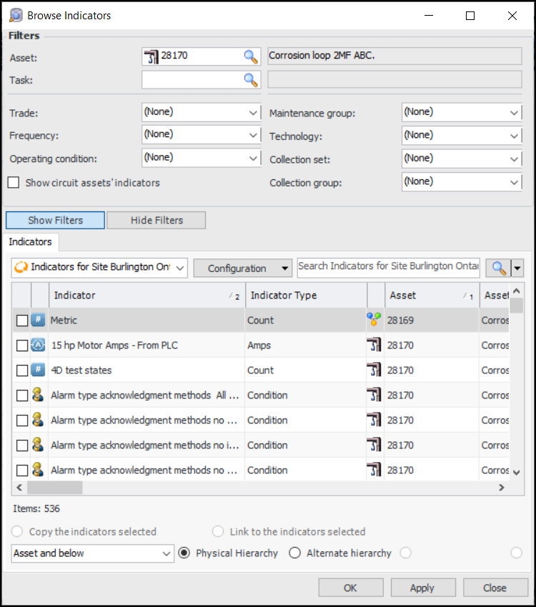 2. Note: Show circuit assets’ indicators is available and selected when the asset that you are filtering on represents a circuit. When selected, the option filters the list to include only indicators for assets included in the circuit.